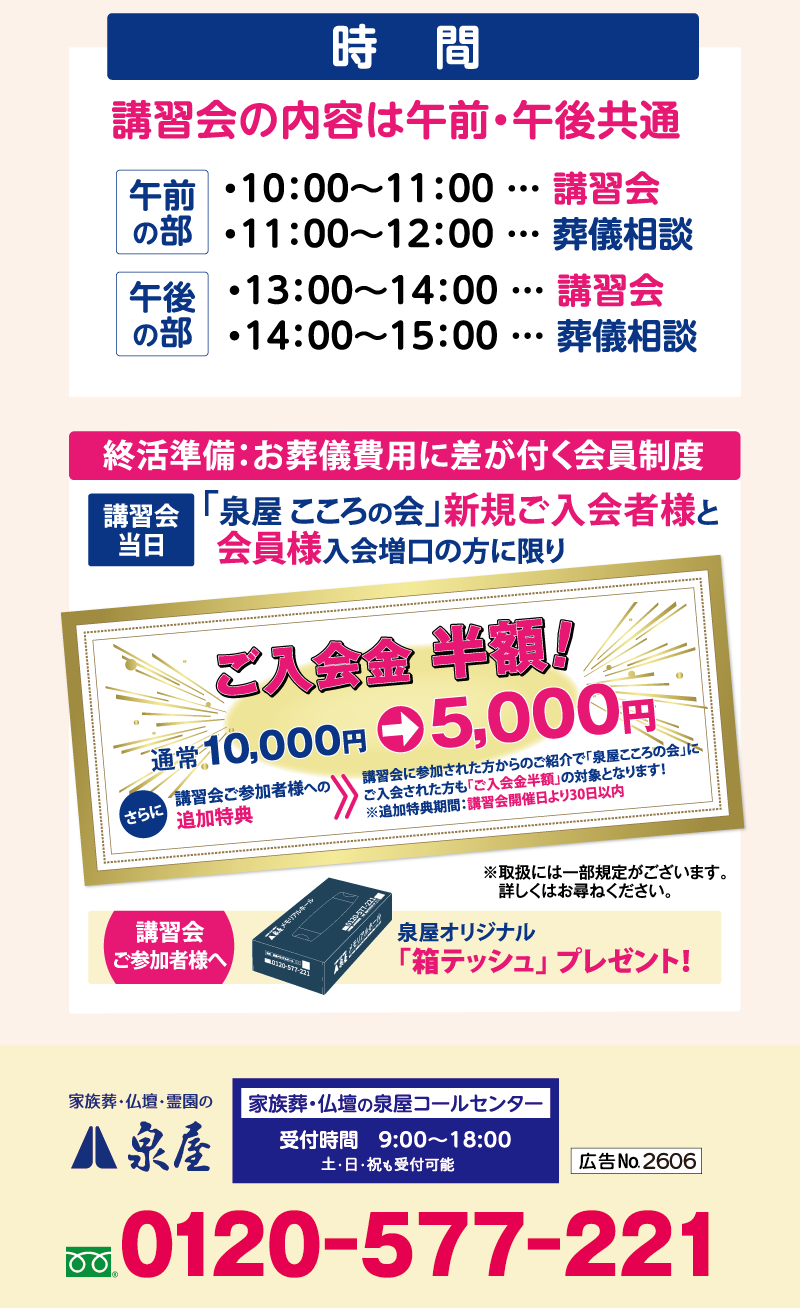 開催予定: 03月05日(木)会場: 家族葬の泉屋 寝屋川香里園ホール -
