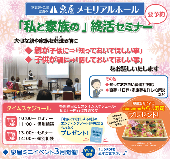 【泉屋 メモリアルホール香里園】にて3/9・13開催