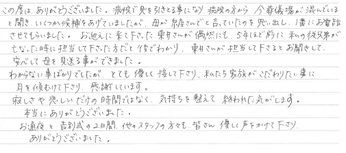 この度はありがとうございました。病院で息を引き取る事になり、病院の方から、今葬儀場が混んでいると聞き、いくつか候補をあげていましたが、母が泉屋さんでと言っていたのを思い出し、一番にお電話させてもらいました。