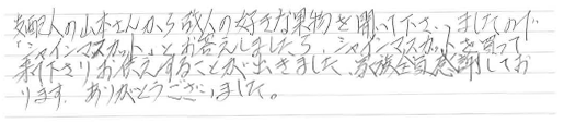 支配人の山本さんから故人の好きな果物を聞いて下さいましたので、シャインマスカットとお答えしましたら、シャインマスカットを買って来てくださりお供えすることができました。