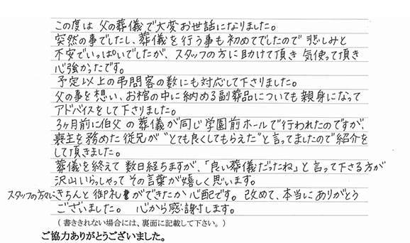 突然の事でしたし、葬儀を行うことも初めてでしたので悲しみと不安でいっぱいでしたが、スタッフの方に助けて頂き、気遣って頂き心強かったです。