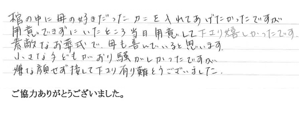 棺の中に母の好きだったカニを入れてあげたかったですが、用意できずにいたところ、当日用意して下さり嬉しかったです。