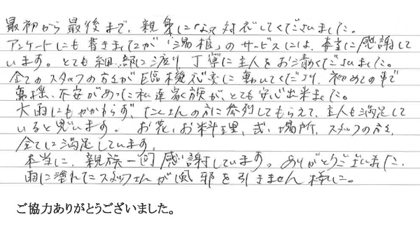 アンケートにも書きましたが「湯灌」のサービスには、本当に感謝しています。とても細部に渡り丁寧に主人をお清めくださいました。